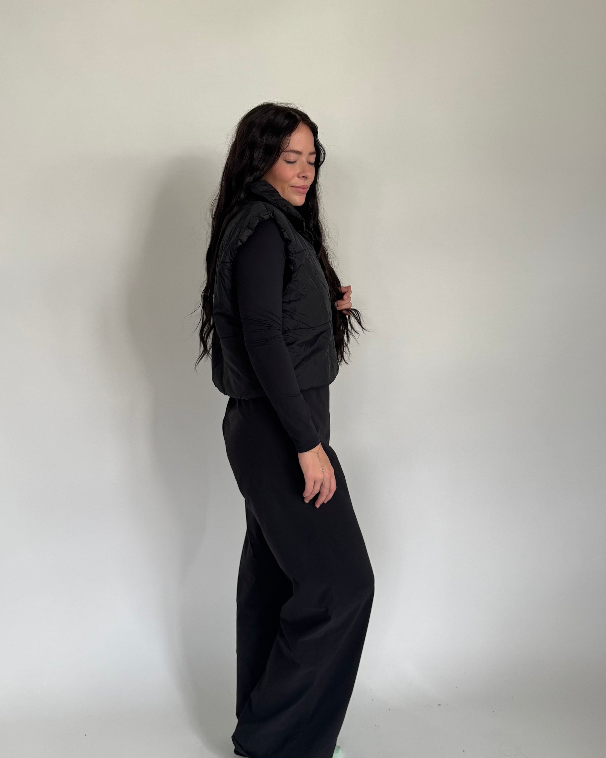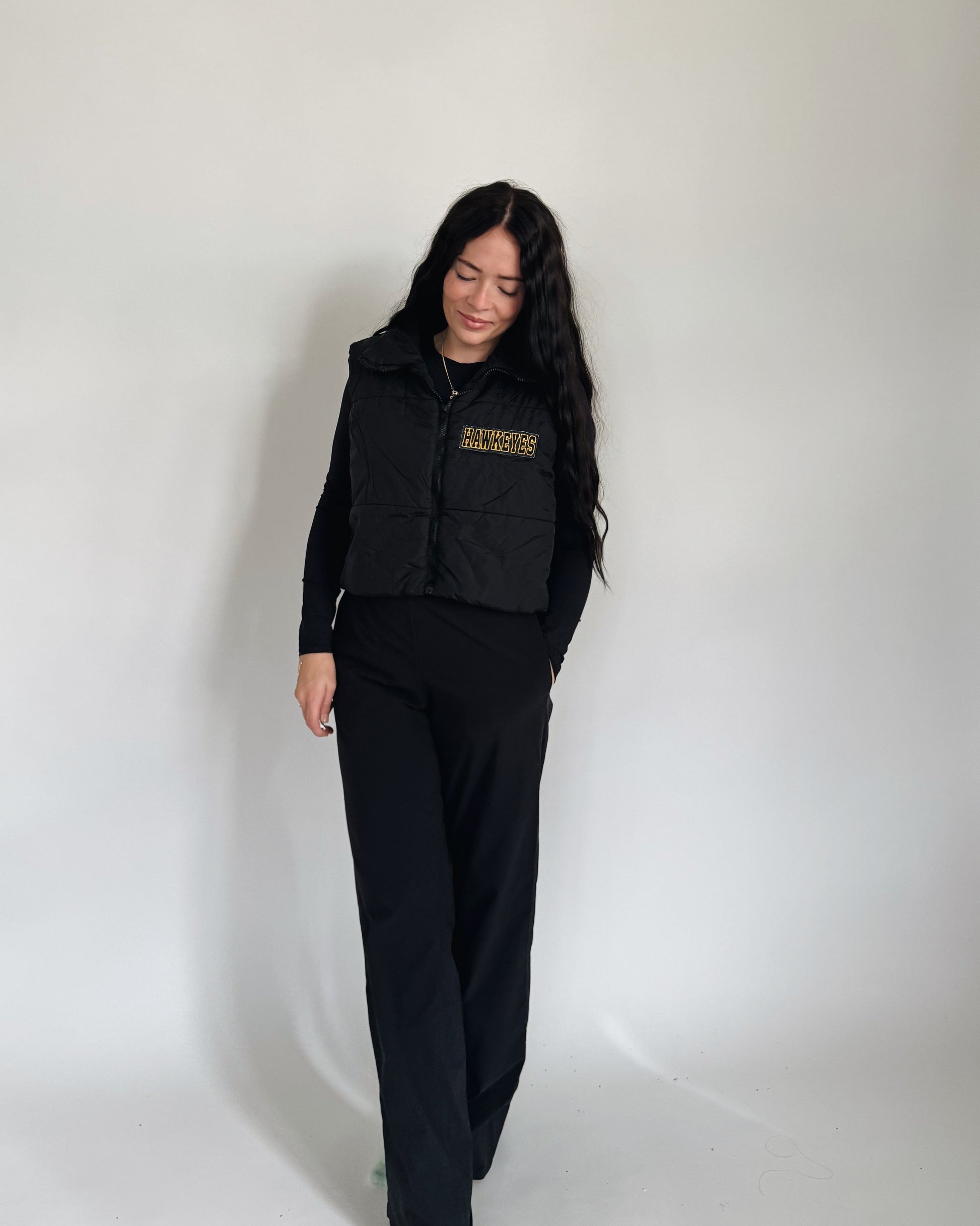 Black cropped puffer vest, has hawkeye logo on front and back from a sweatshirt.