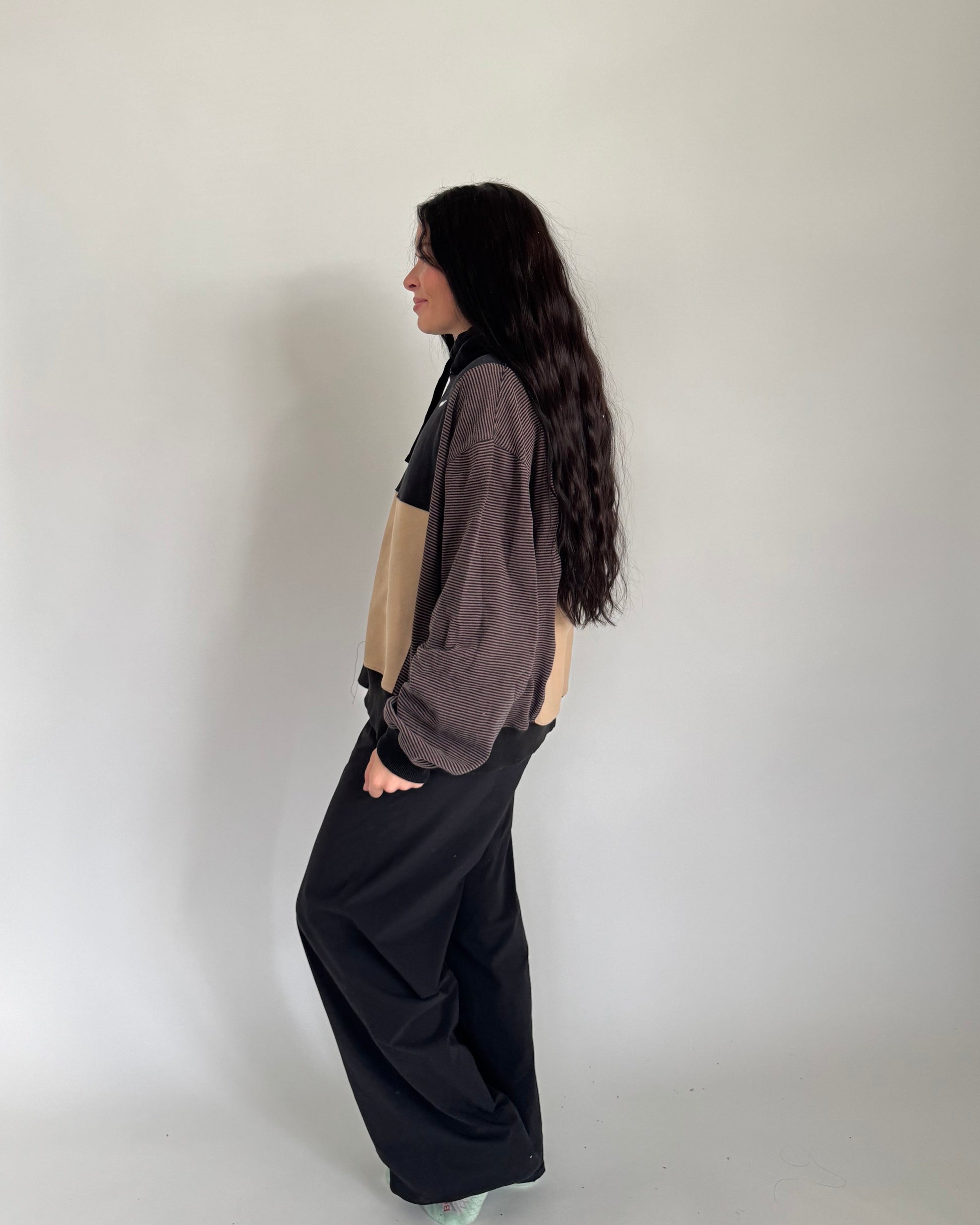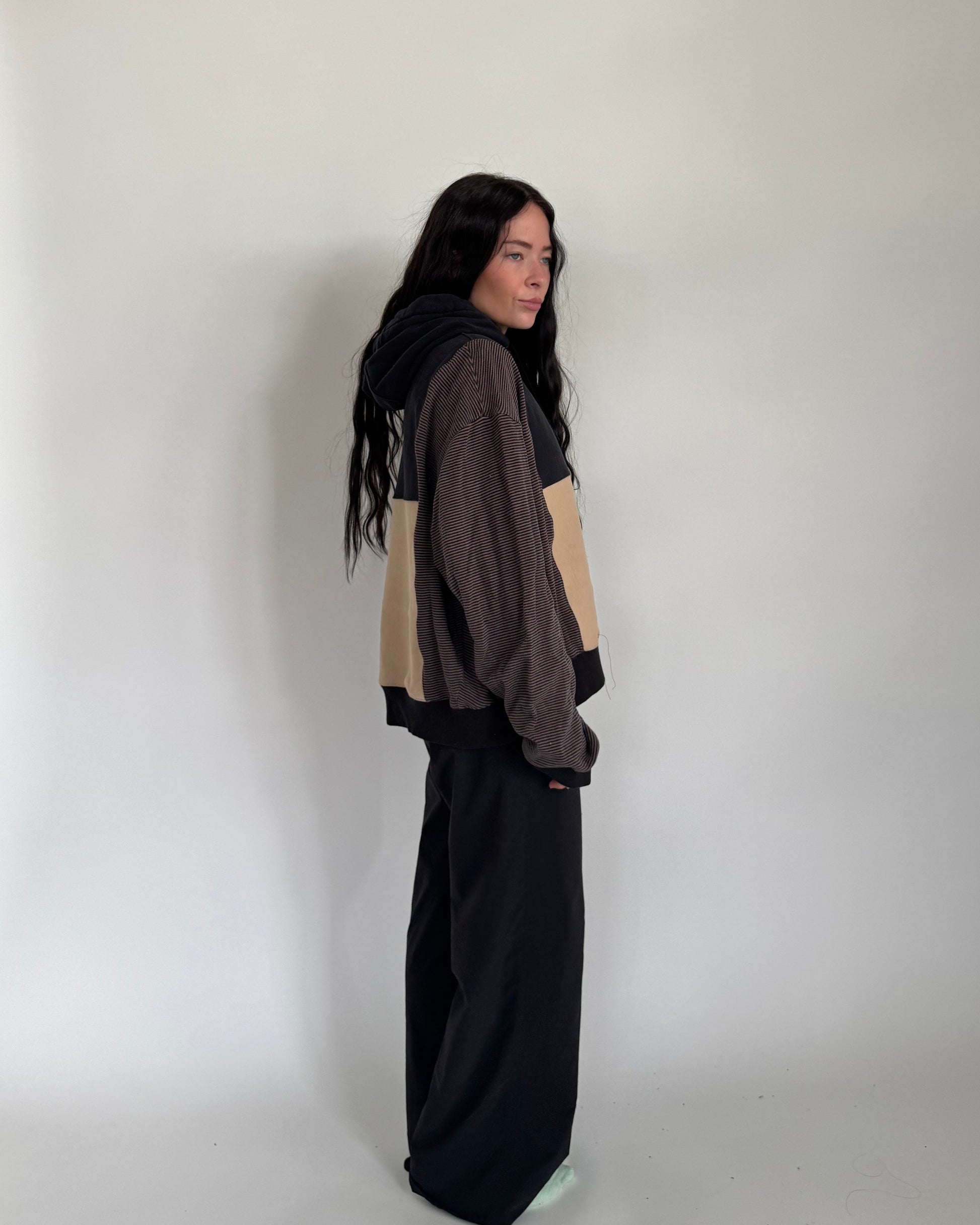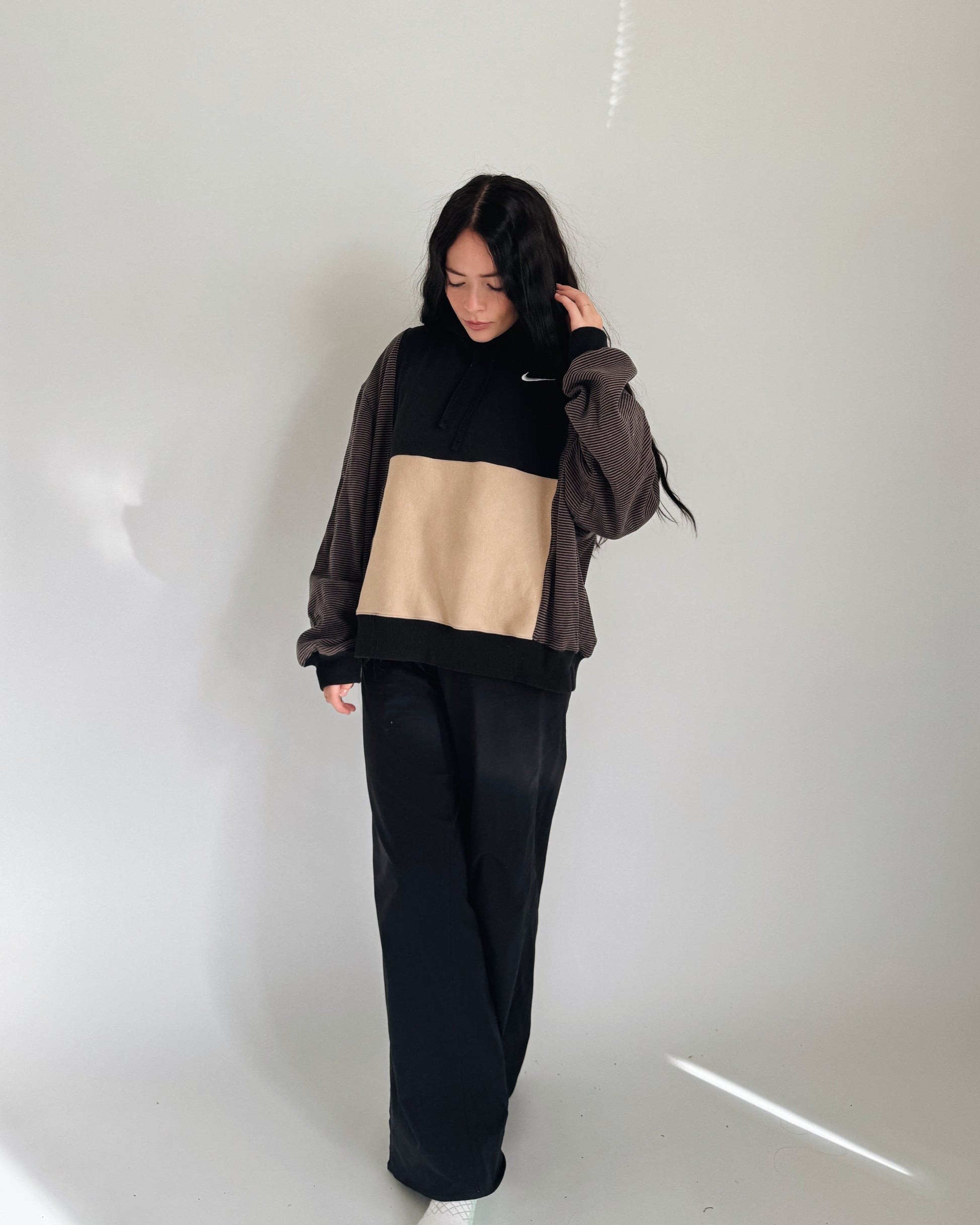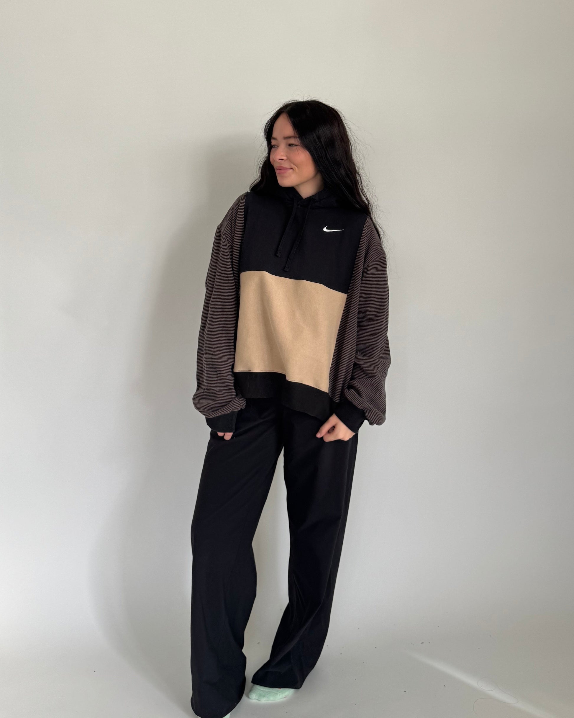 Cropped Nike hoodie with black, tan, and brown/black stripes