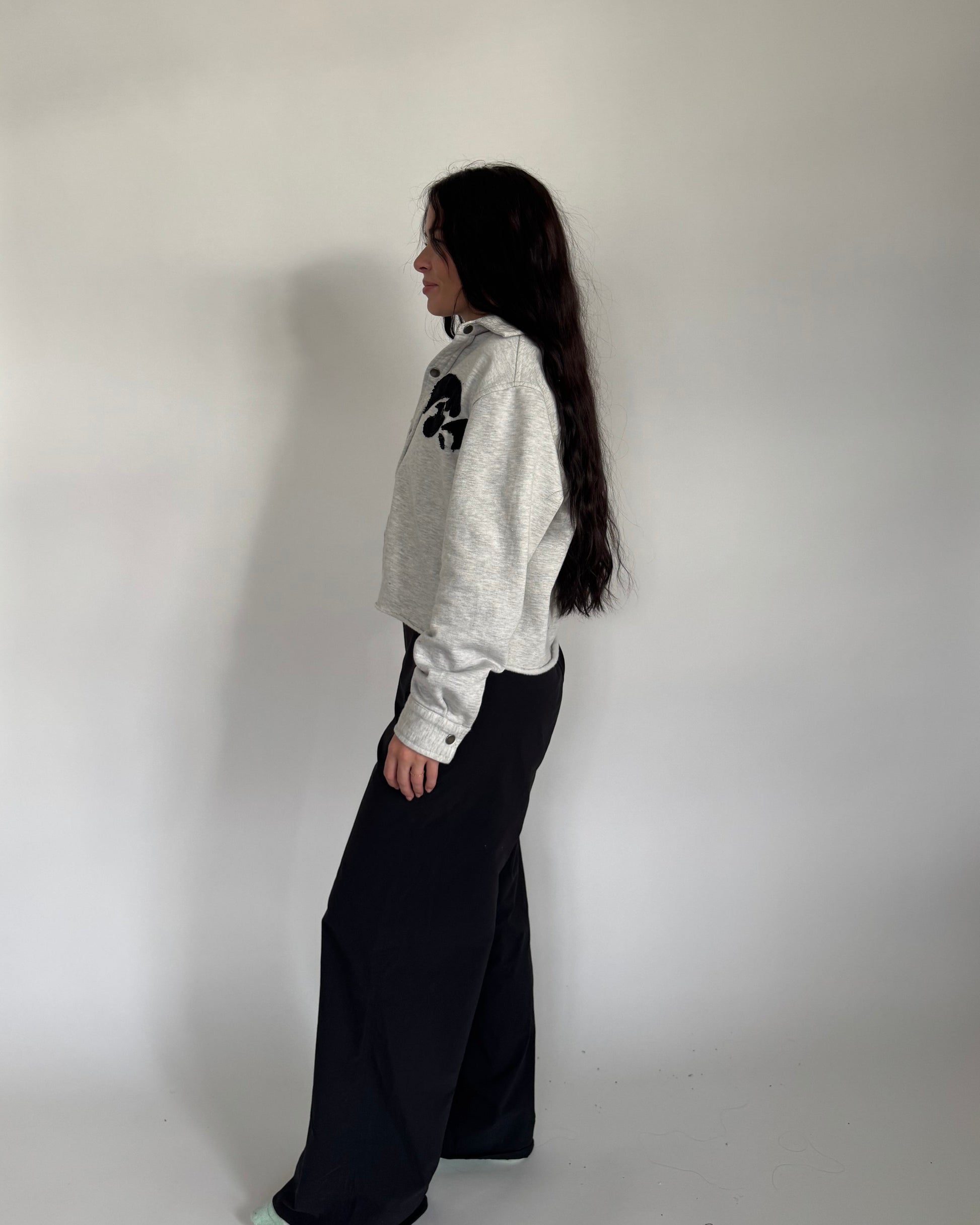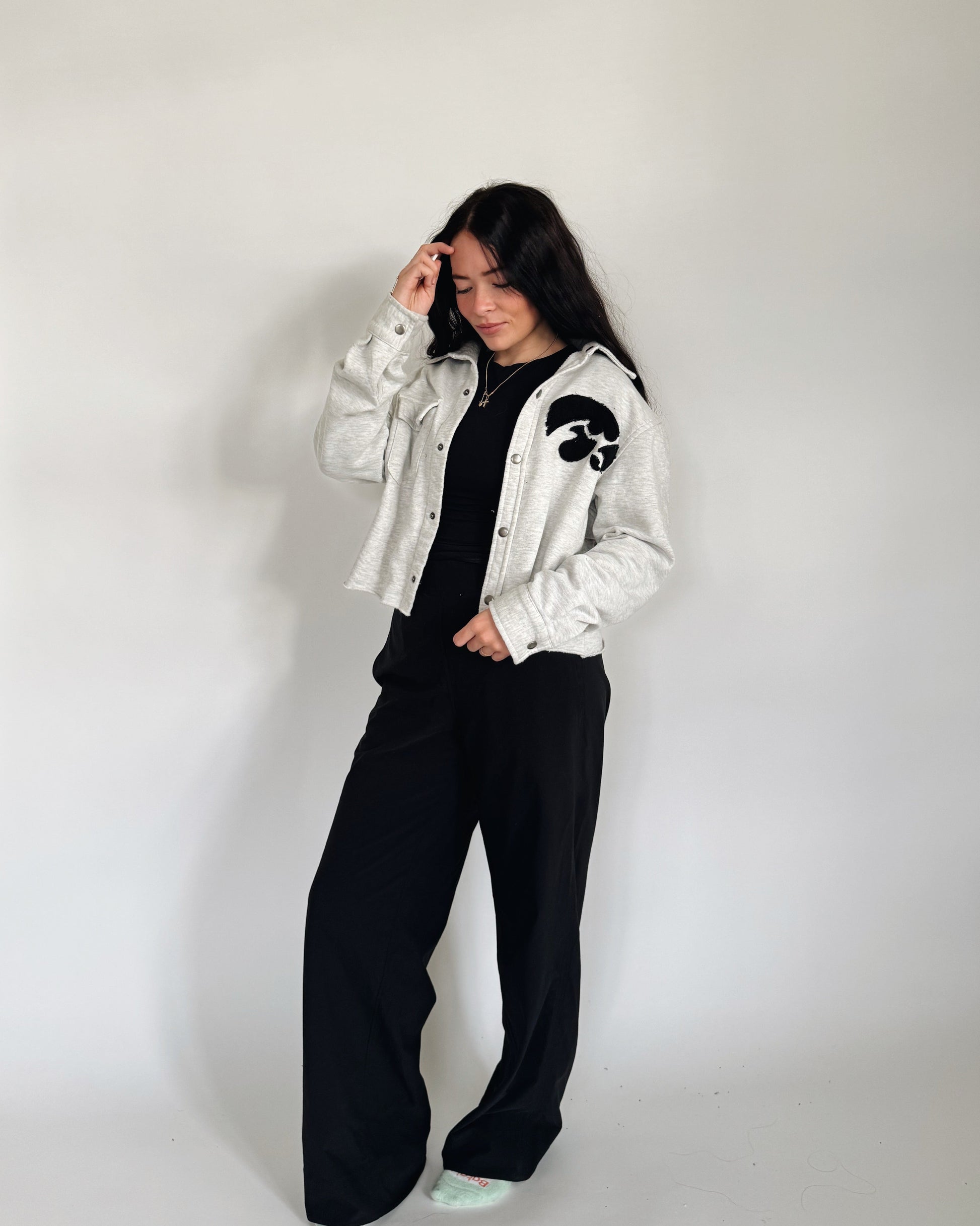 Cropped raw hem hawkeyes jacket. Hawkeye logo is meant to have a grungy look, it is made from denim and sweatshirt material and is frayed intentionally.